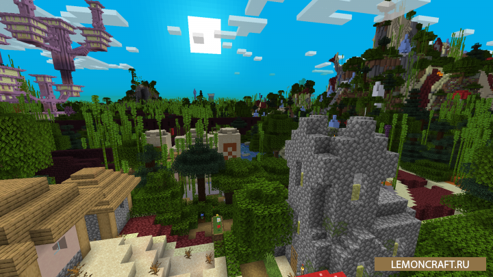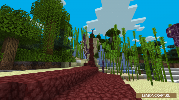 Мод на все биомы в одном мире World Blender позволяет собрать все существующие биомы и соединить их все в одном мире. После установки мода вы сможете наблюдать структуры из энд мира, подземелья в новом измерении, например деревья и дорожки будут из нижнего мира, а деревья из энд мира. Рядом с простыми деревьями будут торчать из земли глыбы льда.